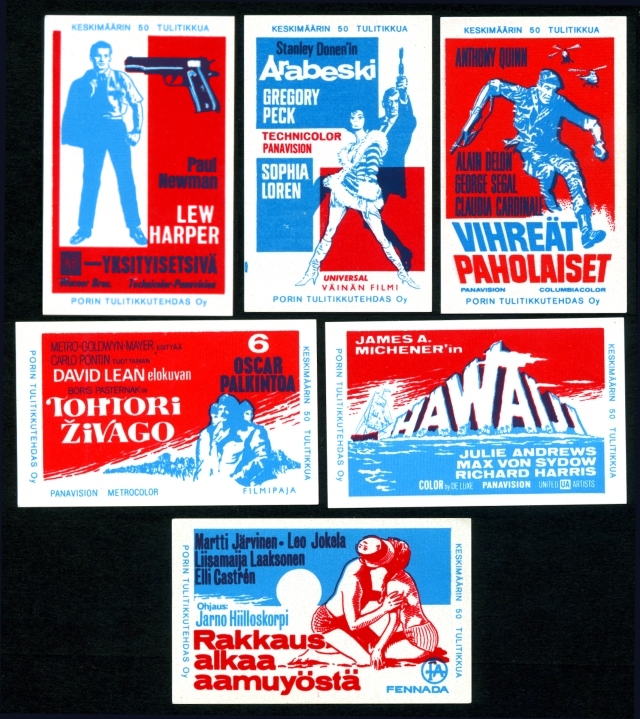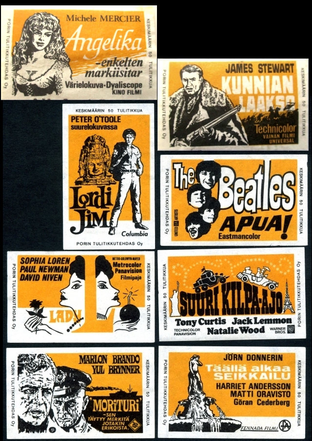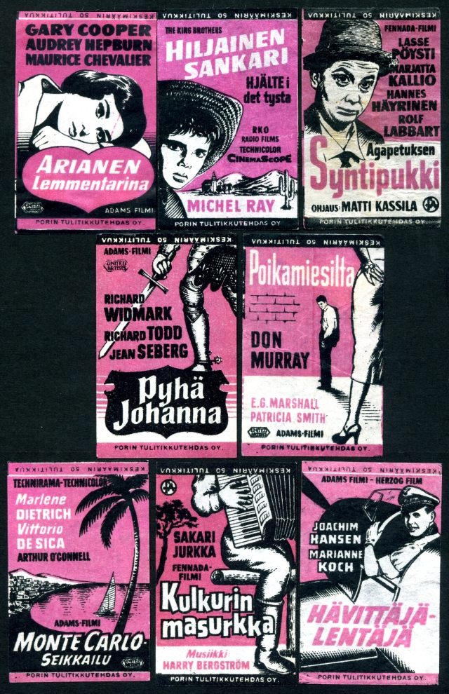 1930-luvulta alkaen tulitikkuja on käytetty ahkerasti elokuvien mainostamiseen. Eri mainossarjojen erottamista helpottaa se, että niissä on ollut usein yhtenäinen väriteema. Ennen sotia Suomi-Filmin mainossarjat tuotti Tulitikku Oy, sotien jälkeen Porin Tulitikkutehdas. Sarjan voi tunnistaa jopa käytetystä paperista. Vuoden 1935 etiketit olivat jämäkkää liitupaperia. Vuoden 1938 etiketit ovat luvattoman ohutta ja haurasta paperia.